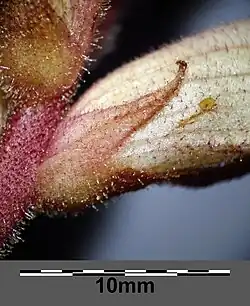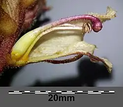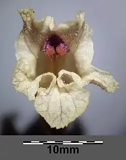 - Kwiaty grzbieciste, siedzące, bez podkwiatków. Podłużnie jajowate lub lancetowate łatki kielicha są wolne i zazwyczaj tak długie, jak rurka korony, czasami tylko nieco dłuższe. Mają 1–3 wyraźne nerwy, które po wyschnięciu brunatnieją. Korona ma kolor biały lub jasnożółty z czerwono nabiegłymi brzegami i długość 10–28 mm. Łatki na wardze dolnej są ząbkowane, na górnej odstające. Sama zaś korona jest na grzbietowej krawędzi nieco zagięta, nad wargą górną nieco załamana, a na szczycie zwrócona w górę. Górna część korony wygląda jak kropkowana, a to przez to, że pokryta jest fioletowymi lub purpurowymi gruczołkami, które często osadzone są na trzonku. Pręciki wyrastają 1–2 mm powyżej nasady korony. W dolnej części są owłosione, wyżej obficie pokryte gruczołami. Słupek jest również obficie ogruczolony, a jego znamiona mają purpurowy kolor[7].