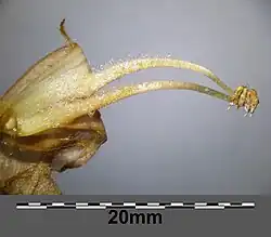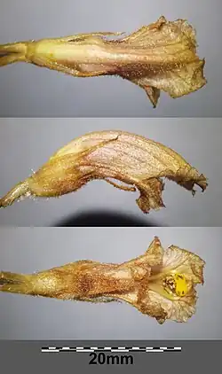 - Grzbieciste, 15–28 mm długości, zebrane w kłos długości ok. 30 cm. Kielich dwułatkowy. Łatki te są 2-zębne, rzadziej całobrzegie, z przodu zrośnięte lub przylegające. Korona kwiatu na początku różowa, później bladożółta, gruczołowato owłosiona. Poniżej pręcików zwęża się w rurkę, a powyżej stopniowo rozszerza. Warga dolna ma 3, zazwyczaj równe łatki, czasami tylko łatka środkowa jest większa. Warga górna jest delikatnie gruczołowato owłosiona, całobrzega lub wycięta, czasami tylko 2-łatkowa. Nitka pręcika owłosiona i zgrubiała w nasadzie. Szyjka słupka gruczołowato owłosiona. Znamię z dwiema łatkami[6].