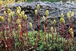 - Zarodnia jest walcowata z wielowarstwową ścianą komórkową, od zewnątrz z epidermą z aparatami szparkowymi, poza tym także z miękiszem asymilacyjnym. Przez jej środek biegnie kolumna zbudowana z 16 szeregów komórek. Zarodnia powstaje sukcesywnie u swej nasady, tak że w swej górnej części zawiera dojrzałe i wysypujące się zarodniki, podczas gdy w dole wciąż następują podziały komórek. Obok zarodników powstają sprężyce, ale te wykształcone są szczątkowo i dlatego określane są także mianem „pseudosprężyc”. Zarodnia otwiera się od góry ku dołowi dwiema klapami, często spiralnie skręconymi. Od dołu zarodnia otoczona jest okrywą zwaną perychecjum tworzoną przez gametofit[3].
