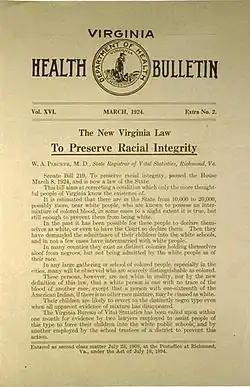 W Wirginii prawo to zostało powiązane z eugeniką poprzez Racial Integrity Act z 1924 roku, mający zapobiegać m.in. rodzeniu „hybryd” oraz „aspirowaniu negroidów do białej rasy”. Wnioskodawca tej ustawy, lekarz Walter Plecker, zaproponował wyjątek dla pochodzenia indiańskiego w wymiarze 1/64, dopuszczono jednak posiadanie jednej szesnastej krwi indiańskiej ze względu na to, iż wielu senatorów stanu Wirginia i tzw. First Families of Virginia szczyciło się pochodzeniem od wodzów indiańskich, w tym księżniczki Pocahontas[16]. Stany: Floryda, Indiana, Kentucky, Maryland, Missouri, Nebraska, Północna Dakota i Utah były pod tym względem bardziej liberalne, dopuszczając domieszkę 1/16, bądź 1/32 krwi innej niż biała dla osób uznanych za białych. Federalną podstawą prawną do takich legislacji były Prawa Jima Crowa z 1896 roku, wszakże zakazy małżeństw międzyrasowych, nie tak rekstrykcyjne, istniały już wcześniej z innych powodów i poza Południem wcześniej też zostały zniesione[10][15].