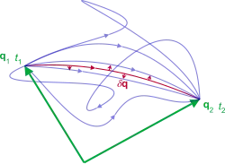 - Rzeczywisty układ fizyczny porusza się po trajektorii, dla której działanie Hamiltona przyjmuje wartość stacjonarną (tj. minimum, maksimum lub punkt przegięcia), przy czym w obliczaniu działania rozważa się wszystkie możliwe trajektorie łączące zadany punkt początkowy i końcowy w zadanym czasie.