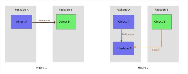 Rysunki 1 i 2 przedstawiają kod o tej samej funkcjonalności, jednak na rysunku 2 użyto interfejsu, aby odwrócić zależność. Kierunek zależności można wybrać tak, aby maksymalizować możliwość ponownego użycia kodu wyższego poziomu i wyeliminować cykliczne zależności.