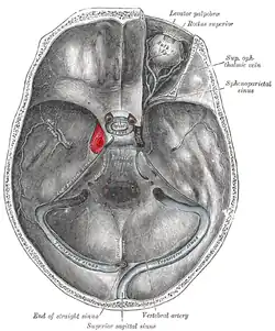 - zatoka klinowo-ciemieniowa – zbierająca krew z powierzchownych żył półkul mózgu. Uchodzi do zatoki pod wyrostkiem pochyłym przednim, często przedtem łącząc się z żyłą środkową powierzchowną mózgu;