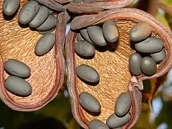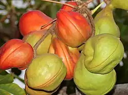 - Czerwone, drewniejące po dojrzeniu i pękające mieszki. Nasiona czarne, owalne, o konsystencji oliwek i mocnym aromacie kakao. Jadalne, jednak niedojrzałe mogą wywoływać biegunkę.