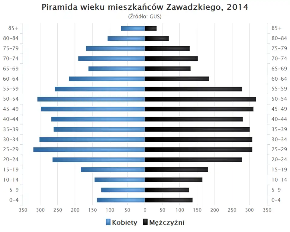 - Piramida wieku mieszkańców Zawadzkiego w 2014 roku[8].