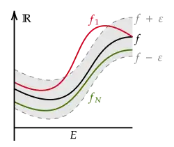 Def. Ciąg funkcji określonych na podzbiorze zbioru liczb rzeczywistych zbiega jednostajnie do funkcji , jeśli dla dowolnej liczby istnieje liczba naturalna taka, że funkcje są odległe od funkcji o mniej niż w każdym punkcie swojej dziedziny, tj.[3]