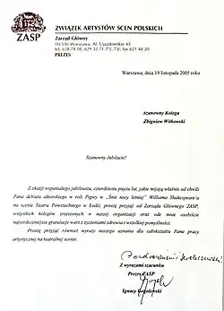 - 1 2 Dyplom ukończenia studiów na Wydziale Aktorskim Państwowej Wyższej Szkoły Teatralnej im. L. Schillera W Łodzi, wydany 15.06.1961 (w archiwum rodzinnym)