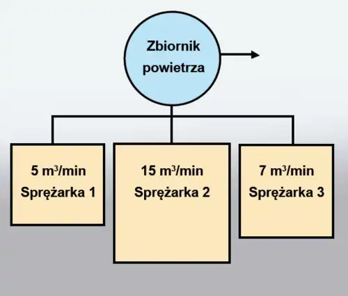 Jeżeli system składa się z kilku sprężarek to zbiornik powietrza jest zawsze wymiarowany w oparciu o wydajność największej sprężarki.