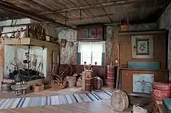 Wnętrza pokoi były wykwitnie dekorowane, co było świadectwem zamożności danego chłopa[3]. Za zdobienia odpowiedzialni byli najczęściej lokalni artyści z Hälsinglandu, jak również wędrowni malarze z sąsiedniej Dalarny. Dekoracje mają formę malowanych na tkaninie lub papierze tapet, utrzymanych w charakterystycznym stylu znanym jako dalmålning, a także namalowane są bezpośrednio na drewnie[2]. Malowidła stanowią połączenie miejscowej sztuki ludowej oraz preferowanych przez ówczesne szwedzkie ziemiaństwo stylów, takich jak barok, rokoko oraz styl gustawiański[3][2]. Motywy dzieł były głównie biblijne, jednak postacie na obrazach przedstawiane były w XIX‑wiecznych strojach[2]. Szczytowy okres wykonywania technik zdobniczych zastosowanych w domach w Hälsinglandzie przypada na lata 1800–1870[4].
