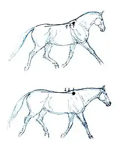 Zebranie z zewnątrz objawia się uwypuklonym grzbietem, obniżeniem zadu, długą i zaokrągloną szyją (najwyższym punktem staje się potylica) oraz dużą ekspresją ruchu konia. Nos konia jest ustawiony lekko przed pionem. Podstawową pomocą służącą do zebrania konia jest półparada.