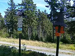 Kluczowym punktem turystycznym jest – oddalone o około 2,1 km na południe od szczytu – skrzyżowanie turystyczne U Huberta[29], z podaną na tablicy informacyjnej wysokością 798 m, przez które przechodzi jeden ze szlaków turystycznych, jedyny szlak rowerowy oraz trasa narciarstwa biegowego[5][30]. Ponadto w odległości około 280 m na południe od szczytu, przy żółtym szlaku turystycznym