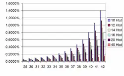 Częstość trisomii 18 w zależności od wieku matki (oś odciętych, 25–42 lat) i okresu ciąży (tygodnie Hbd). Na podstawie danych Snijdersa i wsp.[3]