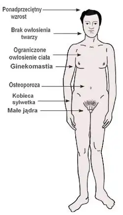 47,XXYczęsto (38-88%[12][13]) rozwija się obustronna, niebolesna ginekomastia i rzadko występuje mutacja głosu - obserwuje się zmniejszenie rozmiaru jąder, które dodatkowo mają nieprawidłowo twardą konsystencję; ich objętość po ukończeniu pokwitania zwykle nie przekracza 10 ml[12]; powrózki nasienne, nasieniowody, gruczoł krokowy i pęcherzyki nasienne nie wykazują odchyleń