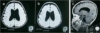 47,XXY/48,XXXY/49,XXXXY uwidaczniające niekomunikujące wodogłowie (A, B) i nieco hipoplastyczne ciało modzelowate (C)[20].W przeciwieństwie do chorych z kariotypem 48,XXYY i 48,XXXY, pacjenci 49,XXXXY są niscy; mają nasilone cechy dysmorficzne (hiperteloryzm, płaską nasadę nosa, mongoidalne ustawienie szpar powiekowych), mogą urodzić się z rozszczepem podniebienia i języczka, nierzadkie są wady wrodzone serca (najczęściej przetrwały przewód Botalla), synostoza promieniowo-łokciowa, stopa wydrążona (pes cavus), kolana koślawe (genu valgum), hipotonia i wiotkość w stawach. Również występują zaburzenia psychiczne. Fenotyp jest na tyle odrębny od fenotypu klasycznego zespołu Klinefeltera, że na określenie tej rzadkiej aneuploidii wprowadzono termin zespołu Fraccaro[20][21][22].