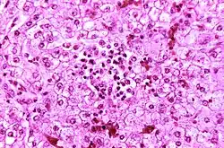 ![]() Preparat sekcyjny wątroby pacjenta z zespołem Reye’a. Na przekroju narządu widać charakterystyczną bladość wywołaną nagromadzeniem lipidów w hepatocytach | |