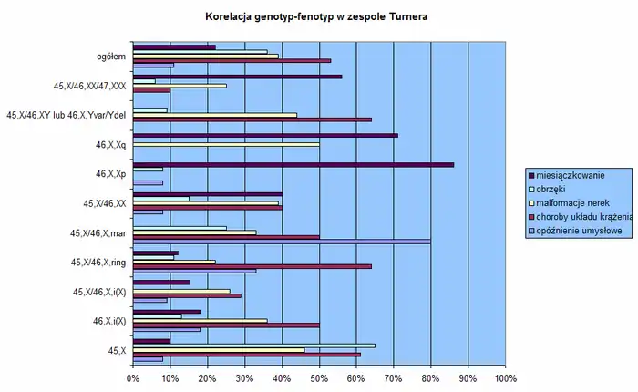45,X045,X0, w pozostałych 30% obecny był izochromosom X zawierający podwójne długie ramię – 46,X i(Xq)Zespół Turnera (ang. Turner's syndrome, łac. syndroma Turner) – uwarunkowany genetycznie zespół wad wrodzonych spowodowany całkowitym lub częściowym brakiem jednego z chromosomów X we wszystkich komórkach organizmu lub w pewnej ich części. Występuje u 1 na 2000 – 2500 urodzonych dziewczynek[1][2]. Najważniejsze cechy występujące u osób z zespołem Turnera to: niski wzrost, słabo zaznaczone cechy żeńskie i wrodzona dysgenezja gonad powodująca w większości przypadków bezpłodność.