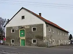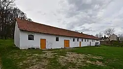 Stajnia z wozownią, murowane, parterowe, nakryte dachem dwuspadowym, wybudowane na rzucie litery „L” obok oficyny. W dłuższym skrzydle wybudowano piętrową bramę przejazdową, na dachu której bociany zakładają swe gniazdo(zobacz) od niepamiętnych czasów[8]. Obora oraz spichlerz wybudowane z kamienia i cegły na planie prostokąta nakryte dachem dwuspadowym[5].