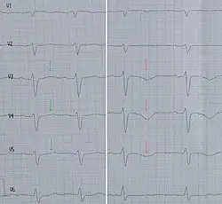 - Przemijająca akineza lub dyskineza koniuszka lewej komory i środkowej części komory, obejmująca obszar unaczynienia więcej niż jednej tętnicy wieńcowej