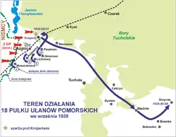W tym czasie 18 pułk ułanów, stanowiący ariergardę Zgrupowania, późnym wieczorem odszedł z rejonu Gacna. Tabory zostały skierowane do Drzycimia, skąd miały ruszyć do Grudziądza. Szwadrony bojowe maszerowały dalej przez Wysoką Wieś do rejonu Błądzimia. Kiedy do Wysokiej Wsi przybyły 1. i 2 szwadron, zastały tam łącznika z rozkazem, by maszerować w kierunku Błądzim–Bramka–Bukowiec, a następnie w ślad za brygadą. Oba szwadrony wykonały rozkaz, przyłączając się w rejonie Bukowca do 16 pułku ułanów[38].