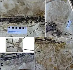 Holotyp został oznakowany jako JPM-0008. Datuje się go na apt w kredzie wczesnej (125–113 milionów lat temu). Okaz ten to podrostek, jest prawie kompletny, a kości zachowały połączenia stawowe. Brakuje jedynie połowy ogona. Dobrze zachowały się za to czaszka i żuchwa. Przetrwały również pozostałości zaopatrzonych w chorągiewkę piór kończyn górnych i ogona. Skamielina jest ściśnięta w bloku czy też płycie skalnej[1].