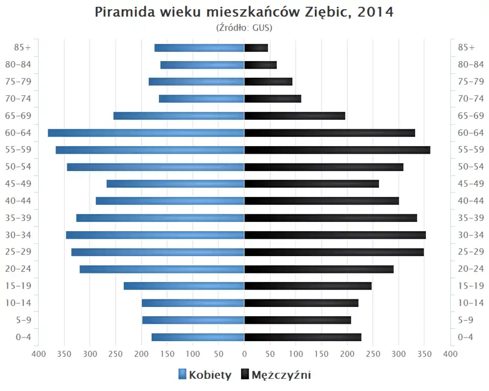 Piramida wieku mieszkańców Ziębic w 2014 roku[19].
