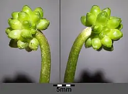 - Zwykle nie zawiązują się u podgatunku typowego, występującego w Europie Środkowej, ewentualnie są źle wykształcone[15] (co najwyżej jako kilka luźnych i rozpostartych niełupek w górnej części dna kwiatowego[6]). U innych podgatunków owocami są nagie lub omszone niełupki o wymiarach 2,6–2,8 (do 3,3 mm[16]) × 1,8–2 mm bez dzióbka[9], zebrane w kulisty owoc zbiorowy, gęsto skupione i w większości wzniesione ku górze. Niełupki zawierają pojedyncze nasiono[6].