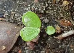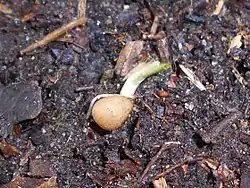 Kiełkowanie jest epigeiczne. Najpierw pojawia się i wydłuża korzeń pierwotny, następnie rozwija się pojedynczy liścień sercowatego kształtu (powstał w wyniku zrośnięcia pierwotnie dwóch liścieni – liczby typowej dla roślin dwuliściennych)[6]. Liścień osadzony jest na ogonku, który osiąga od 1,5 do 4 cm długości. Nasada i szczyty obu klap blaszki są zaokrąglone[22]. W ciągu 2–3 miesięcy po rozpoczęciu kiełkowania rozwijać się zaczyna pierwsza bulwa korzeniowa[6]. W ciągu pierwszego sezonu liście właściwe się nie rozwijają[22], ewentualnie pod jego koniec pojawiają się jeden, rzadko dwa liście[6].