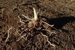 - Początkowo z pędu wyrastają cienkie, białe korzenie korzenie przybyszowe, kolejne, liczne korzenie wykształcają się jako bulwy korzeniowe osiągające od 5 do 100 mm długości, o maczugowatym kształcie[6], tępo zakończone[13].