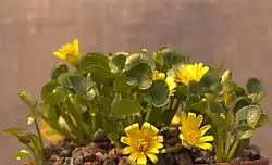- Kwiaty pojedyncze, zwykle obupłciowe, rozwijają się na końcach poszczególnych rozgałęzień pędu[6]. U podgatunku typowego o średnicy 13–30 mm (niektóre podgatunki mają większe kwiaty)[15]. Okwiat składa się z trzech wolnych, szybko odpadających i zielonkawych działek kielicha[6] o wymiarach 4–9 × 3–6 mm oraz najczęściej 8 wolnych, żółtych płatków korony[6] o wymiarach 6–15 × 2–5 mm[15]. Płatki od wewnątrz są błyszczące, od zewnątrz matowe[6]. Liczba pręcików i słupków jest zmienna w granicach od 5 do 72[6].