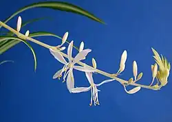 - Niepokaźne, białe na końcach łodygi. Mają 6 wąskich, białych płatków, 6 pręcików i 1 górny słupek z długą szyjką.