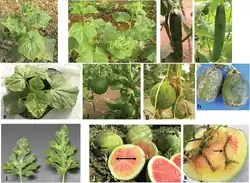 Znane jest występowanie CGMMV w Ameryce Północnej, Europie, Azji, na Bliskim Wschodzie i w Australii. Wirus ten poraża wszystkie warzywa z rodziny dyniowatych: dynię, ogórka, cukinię, melona, tykwę. Objawy różnią się w zależności od szczepu wirusa, jednak najczęściej obserwowanym objawem jest mozaikowe cętkowanie liści. Inne objawy to zanikanie nerwów na liściach, zniekształcenie liści oraz wewnętrzne przebarwienie owoców i gnicie. W przypadku arbuza objawy zazwyczaj obejmują mozaikowate cętkowanie dojrzałych liści, a porażone rośliny mogą wydawać się wyblakłe i skarłowaciałe ze zmianami na łodydze i szypułce. Objawy mogą również pojawiać się na młodych roślinach, a następnie znikać w miarę dojrzewania rośliny, co utrudnia ich wykrycie. Objawy na owocach mogą obejmować żółknięcie wewnętrznego miąższu i powstawanie struktury przypominającej gąbkę. W cukiniach wirus powoduje powstawanie mozaiki i zielonych pasm na dojrzałych liściach, a porażone rośliny są karłowate. Zainfekowane melony wykazują cętkowanie na powierzchni owoców. Porażone owoce nie nadają się do sprzedaży[2].