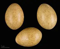- W ciągu roku wyprowadza jeden lub dwa lęgi[7]. W zniesieniu 4 do 9 żółtawych lub szarawych jaj w brunatne lub rude cętki.