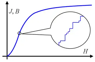 Wewnątrz ferromagnetyka istnieją niejednorodności struktury krystalicznej (defekty składu fizyko-chemicznego, naprężenia szczątkowe, naruszenia spoistości, dyslokacje itp.), które utrudniają przemieszczanie się ścianek Blocha i obroty domen pod wpływem przyłożonego zewnętrznego pola[4]. Do przezwyciężenia tego oporu potrzeba domenom dostarczyć odpowiedniej ilości energii, pochodzącej ze wzrastającego natężenia zewnętrznego pola magnetycznego[5]. Po jej uzyskaniu ścianki przełamują opór, co przejawia się jako gwałtowna zmiana lokalnego stanu namagnesowania materiału – są to skoki Barkhausena, nazywane również szumem Barkhausena.