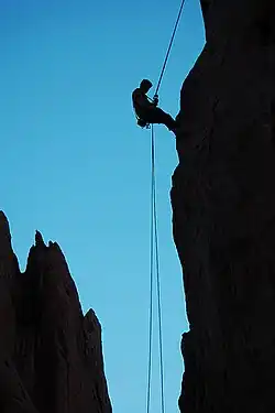 - ↑ Jeśli na dole znajduje się inny wspinacz, może on zabezpieczać zjazd trzymając za końce liny – jej naprężenie spowoduje zatrzymanie zjeżdżającego.