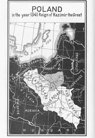1333 przyniósł śmierć Łokietka i wejście na tron w Krakowie Kazimierza Wielkiego. Już w dwa lata później uzyskał pierwszy sukces dyplomatyczny – zrzeczenie się przez Jana Luksemburskiego pretensji do tronu Polski w zamian za 20,000 groszy praskich. Po serii procesów, w 1343 zawarto w Kaliszu pokój z Krzyżakami, przez co odzyskano Kujawy i ziemię dobrzyńską. Udało się wyprzeć wpływy czeskie z Mazowsza i zwasalizować tamtejszych władców piastowskich, dokonano także drobnych korekt na granicy zachodniej (Wschowa, ziemia wieluńska), jednak główny kierunek ekspansji skierowany został na wschód – stopniowo (1340/1349) opanowano Ziemię Przemyską i Ruś Halicką ze Lwowem, a także Podole i Wołyń, ubiegając Węgrów i Litwinów. Dokonano reform wewnętrznych, zezwolono na napływ z Zachodu wyganianych stamtąd Żydów, wybudowano sieć murowanych zamków. Kazimierz Wielki, mimo rozlicznych małżeństw, nie doczekał się męskiego potomka, przez co po jego śmierci w 1370 na tron trafili węgierscy Andegawenowie.