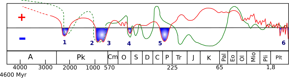W erze mezozoicznej (186 milionów lat) oraz w długich przedziałach czasu w prekambrze nie odnaleziono śladów zlodowaceń (pomijając ewentualne lokalne zlodowacenia obszarów górskich).