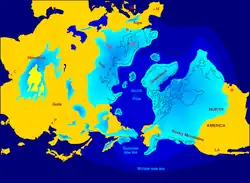 Półkula północna podczas maksimum ostatniego zlodowacenia. Utworzenie warstwy pokrywy śnieżnej o grubości od 3 do 4 km spowodowało globalne obniżenie poziomu mórz o ok. 120 m.