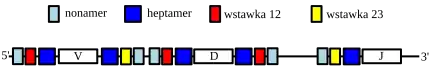 Każdy gen V, D i J posiada z każdej strony układ, na który składają się: heptamer (sekwencja siedmiu nukleotydów) i nonamer (sekwencja dziewięciu nukleotydów), które mają ściśle określony skład nukleotydowy. Pomiędzy nimi natomiast występuje tak zwana wstawka, o długości 12 lub 23 nukleotydów. Reguła 12/23 wynika z tego, że podczas rekombinacji dochodzi do połączenia się tylko tych genów, które mają dwie różne wstawki od strony tworzenia połączenia. Geny V wykazują po stronie 5' wstawkę 12, zaś po stronie 3' wstawkę 23. Geny D po obu stronach mają wstawkę 12, zaś geny J po stronie 5' wykazują obecność wstawki 23, co przedstawione jest poniżej: