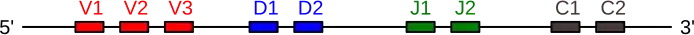 U podstaw zmienności kombinacyjnej leży istnienie wielu różnych genów, które w wyniku łączenia się z sobą tworzą funkcjonalny gen dla części zmiennej przeciwciał. W przypadku łańcucha ciężkiego wyróżnia się kilkadziesiąt genów V, kilkanaście genów D i kilka genów J. Oczywiście niezbędny jest jeszcze DNA kodujący część stałą przeciwciała – jest on zawarty w obrębie genów C. Rozkład genów na chromosomie przedstawia się następująco[a]: