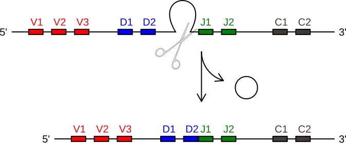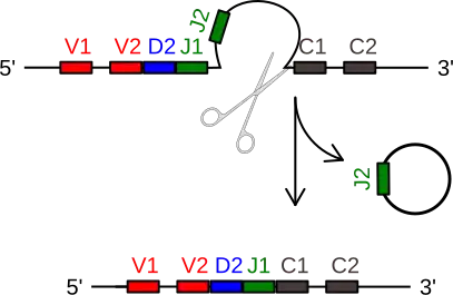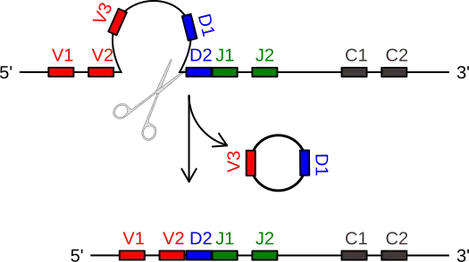 W analogiczny sposób powstaje połączenie między nowo utworzonym genem DJ a genem V, przy czym w przypadku, gdy pomiędzy nimi występują inne geny V lub D, są one wycinane i wchodzą w skład kolistego DNA (podobnie rzecz ma się w przypadku tworzenia genu DJ):