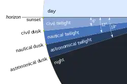 - zmierzch cywilny – środek tarczy słonecznej nie więcej niż 6° poniżej horyzontu