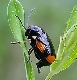 Chrząszcz o krępym, walcowatym ciele długości od 3 do 5 mm. Głowa u samicy jest czarna z parą żółtoczerwonych prążków na czole, a zwykle także z żółtymi plamkami na nadustku i policzkach. U samca głowa ma kolor czarny z żółtą X-kształtną plamą na czole i nadustku oraz żółtymi znakami na przedocznych częściach policzków. Nitkowate czułki mają człony od pierwszego do czwartego lub piątego żółtobrunatne, zwykle z zaczernionymi brzegami przednimi, natomiast pozostałe człony czarne. Kolorystyka przedplecza jest czarna z żółtymi do czerwonych plamami w kątach tylnych, rzadziej barwy te zajmują całe boczne brzegi przedplecza, a u niektórych osobników występuje para skośnych plamek przed tarczką. Punkty na powierzchni przedplecza są drobne, ale wyraźnie widoczne. W widoku grzbietowym boczne krawędzie przedplecza dostrzec można tylko w okolicach tylnych kątów. Pokrywy u typowo ubarwionych osobników mają dwie pary żółtych lub pomarańczowych plam, z których przednia leży za guzami barkowymi i zachodzi na epipleury, a tylna leży na wierzchołku pokryw, nie zachodząc na ich krawędziowe listwy. U ciemnych aberracji tylna para plam zanika, zaś u jasnych prawie całe pokrywy mogą być żółte, pozostawiając czarnymi tylko smugę przyszwową, wąski pasek przy przednim brzegu oraz wąską przepaskę w tyle. Powierzchnię pokryw cechują punkty, formujące wyraźne, całkowicie regularne rzędy. Spód ciała jest całkowicie czarny. Odnóża przedniej pary są brunatne z żółtymi goleniami. Środkowa para odnóży ma czarne uda, brunatne golenie z żółtą plamką podłużną oraz brunatne pozostałe części. Odnóża pary tylnej są brunatne z czarnymi udami. Genitalia samca odznaczają się silnie wygiętym dobrzusznie wierzchołkiem prącia[4].
