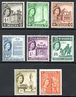 Między styczniem 1956 a 1957 została wypuszczona nowa definitywna seria. Przedstawia ona nową królową Elżbietę II. Seria ta zawiera znaczki o wartości do £1, przedstawiające lokalne budynki, pomniki i widoki, lub ważne dokumenty związane z rolą Malty w czasie II wojny światowej. Od 1957 zostały wydane różne znaczki, zaprojektowane przez Emvina Cremonę, najwspanialsze z nich upamiętniają rocznicę odznaczenia Malty Krzyżem Jerzego. Cremona zaprojektował je w abstrakcyjnym post-kubistycznym stylu, który zdominuje później większość wydań z lat sześćdziesiątych i siedemdziesiątych, włącznie z dwoma seriami definitywnymi. Malta wydała inne serie pamiątkowe we wczesnych latach 60., i ostatnią przed uzyskaniem niepodległości była seria 3-znaczkowa z okazji Europejskiego Kongresu Lekarzy Katolickich. Została wydana 5 września 1964, zaledwie dwa tygodnie przed uzyskaniem niepodległości[3].