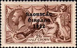Nadruki Saorstát Éireann (Wolne Państwo Irlandzkie) wprowadzono 11 grudnia 1922 roku. Wykorzystując pismo bezszeryfowe, Thom, Harrison i drukarnia rządowa wykonali trzywersowy nadruk. W 1934 roku pojawiły się, wykonane przez Waterlow & Sons[14], rytowane znaczki z podobizną króla Jerzego V o wartości nominalnej: 2/6 (dwa szylingi i sześć pensów), 5/- (pięć szylingów) i 10/- (dziesięć szylingów). Aby móc ich używać w Irlandii, w 1937 roku wykonano na nich nadruk. Była to ostatnia seria znaczków posiadająca nadruk[15].