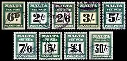 Pierwsze znaczki paszportowe Malty zostały wydane w 1933 i zawierały napisy FEE PAID i PASSPORT. Zostały wydrukowane w kolorze głębokiej zieleni, a wartości w kolorze czarnym. Przedruki i dodatkowe wartości tego wydania trwały do 1967[3][4].