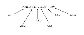 Każdy ze znaków oddzielonych jest od siebie kropką (separatorem). Jedynym przypadkiem, kiedy minus występuje między oznaczeniem komórki organizacyjnej a symbolem klasyfikacyjnym, jest wydzielenie z wydziału istniejącego w nim referatu. Np. ABC-A.123.77.3.2011.JW.