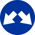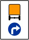 C-17: nakazany kierunek jazdy dla pojazdów z towarami niebezpiecznymi | Znak wskazuje kierunek jazdy na skrzyżowaniu dla pojazdów przewożących towary niebezpieczne w ilościach, dla których jest wymagane oznakowanie pojazdu tablicami ostrzegawczymi barwy pomarańczowej. Kierunek wskazany może być symbolem znaku C-2, C-4, C-5, C-6, C-7 lub C-8. Znak stosowany w szczególności do wskazania miejsc postojowych dla pojazdów z towarami niebezpiecznymi, np. w terminalach odpraw celnych. |