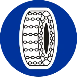 C-18: nakaz używania łańcuchów przeciwpoślizgowych | Znak oznacza, że kierujący pojazdem silnikowym ma obowiązek stosować łańcuchy przeciwpoślizgowe na co najmniej dwóch kołach napędowych. Stosowany w okresie zimowym na drogach, na których podczas opadów śniegu występują trudności poruszania się pojazdów niewyposażonych w łańcuchy. Umieszczona pod znakiem tabliczka od T-23a do T-23j oznacza, że nakaz dotyczy pojazdów określonych na tabliczce. |