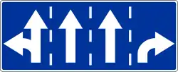 F-10: kierunki na pasach ruchu | Wskazuje dozwolone, zgodnie ze strzałkami umieszczonymi na znaku, kierunki jazdy z poszczególnych pasów ruchu. Umieszczona na znaku strzałka zezwalająca na skręcanie w lewo ze skrajnego lewego pasa ruchu oznacza także zezwolenie na zawracanie, chyba że jest to zabronione znakiem B-23 lub ruch jest kierowany sygnalizatorem S-3. | |||||||||||||