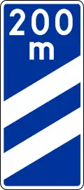 F-14b: tablica wskaźnikowa na autostradzie umieszczana w odległości 200 m przed pasem wyłączania | Informuje o zbliżaniu się do początku pasa prowadzącego do wyjazdu z autostrady (pasa wyłączania). | |||||||||||||